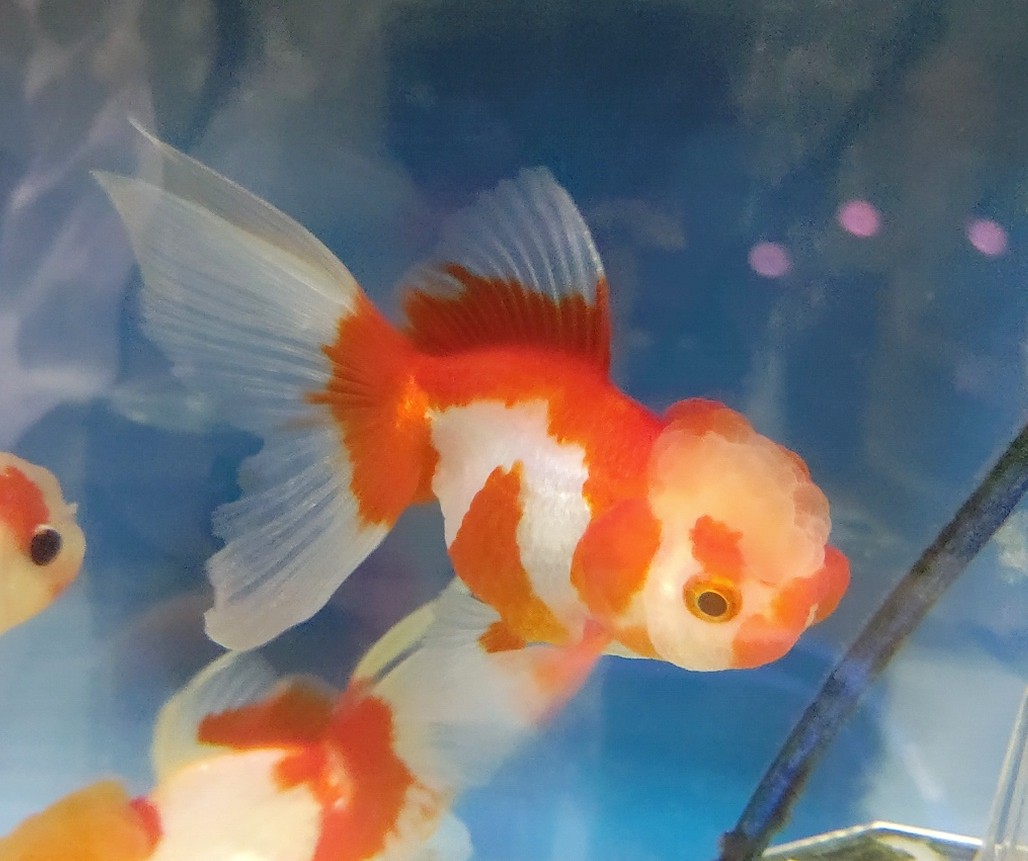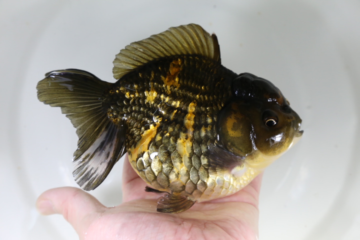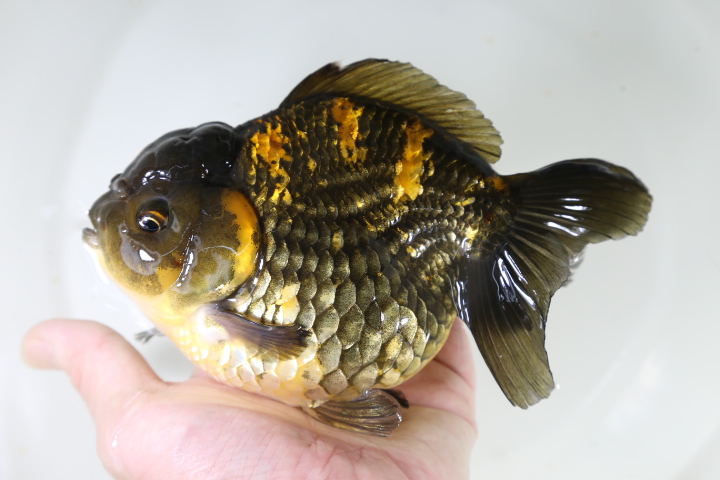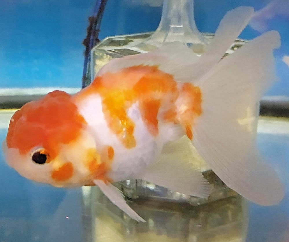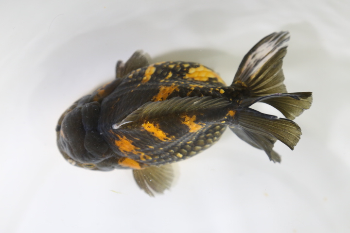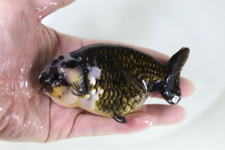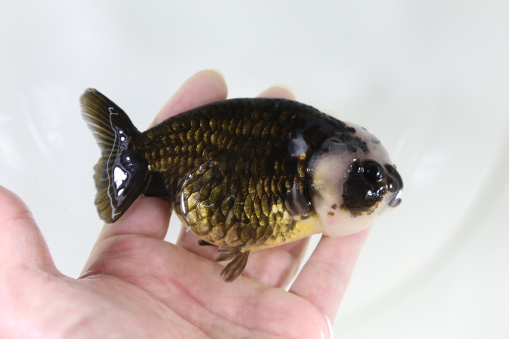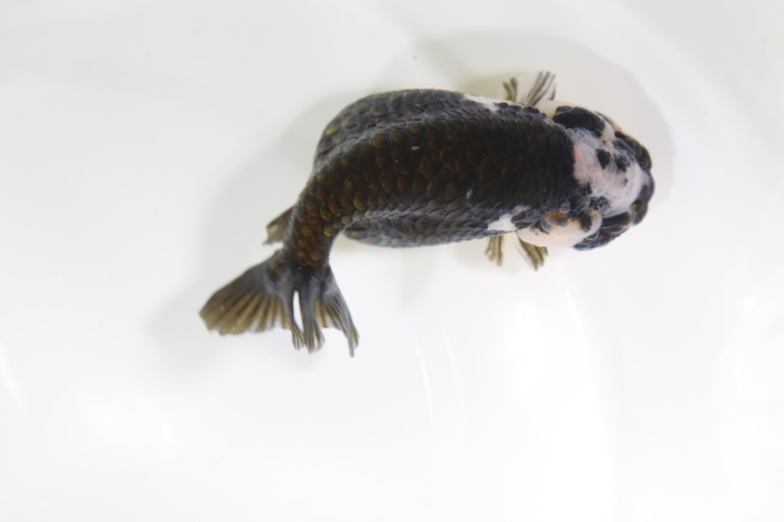 なので。この子は黒らんちゅうというよりもキャリコ(モザイク透明鱗)の中から出てきた黒色の個体です。 キャリコの中に黒っぽい(正確に言うと濃い緑)子はよくいますが。 墨色の黒の子ってあまり見かけませんね。 しかも白が入るとなると・・・ 実はかなりレアです。 パンダ系かな???