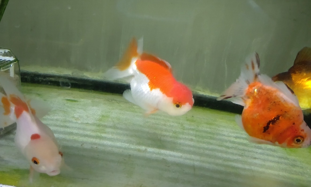 手前は紅白透明鱗蘭畴←中国のもみじらんちゅう